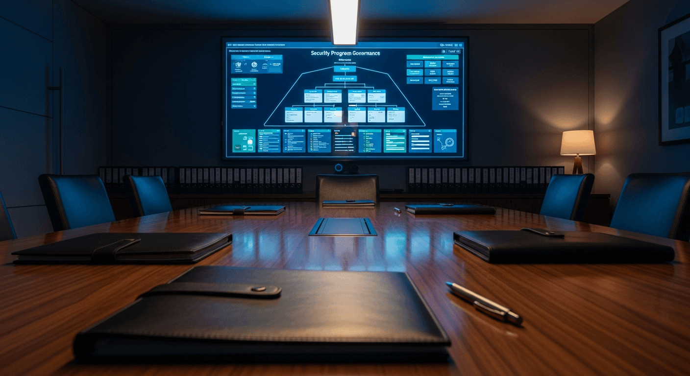 Description: An executive security briefing room at night with a glass wall dashboard displaying a tiered security program governance hierarchy.